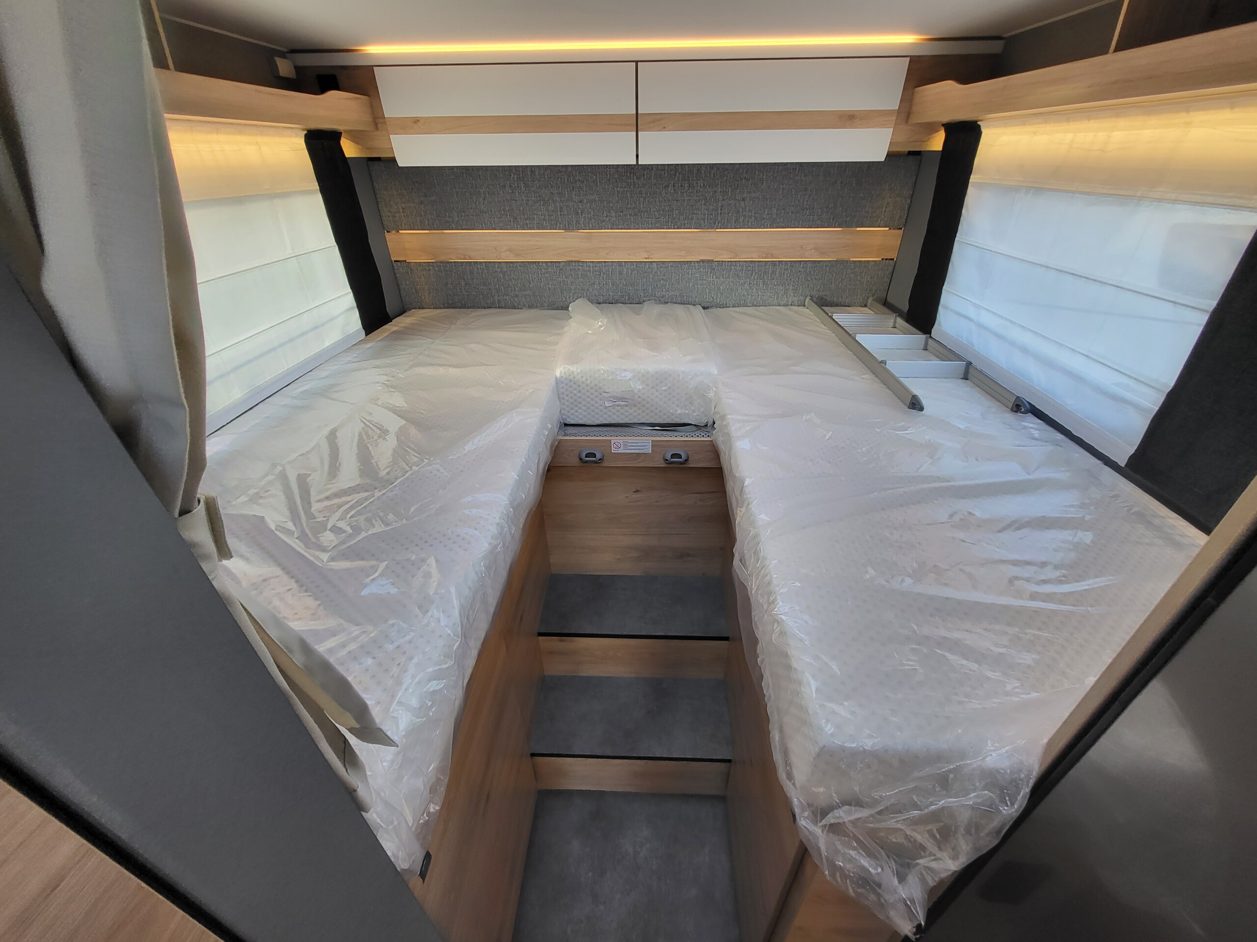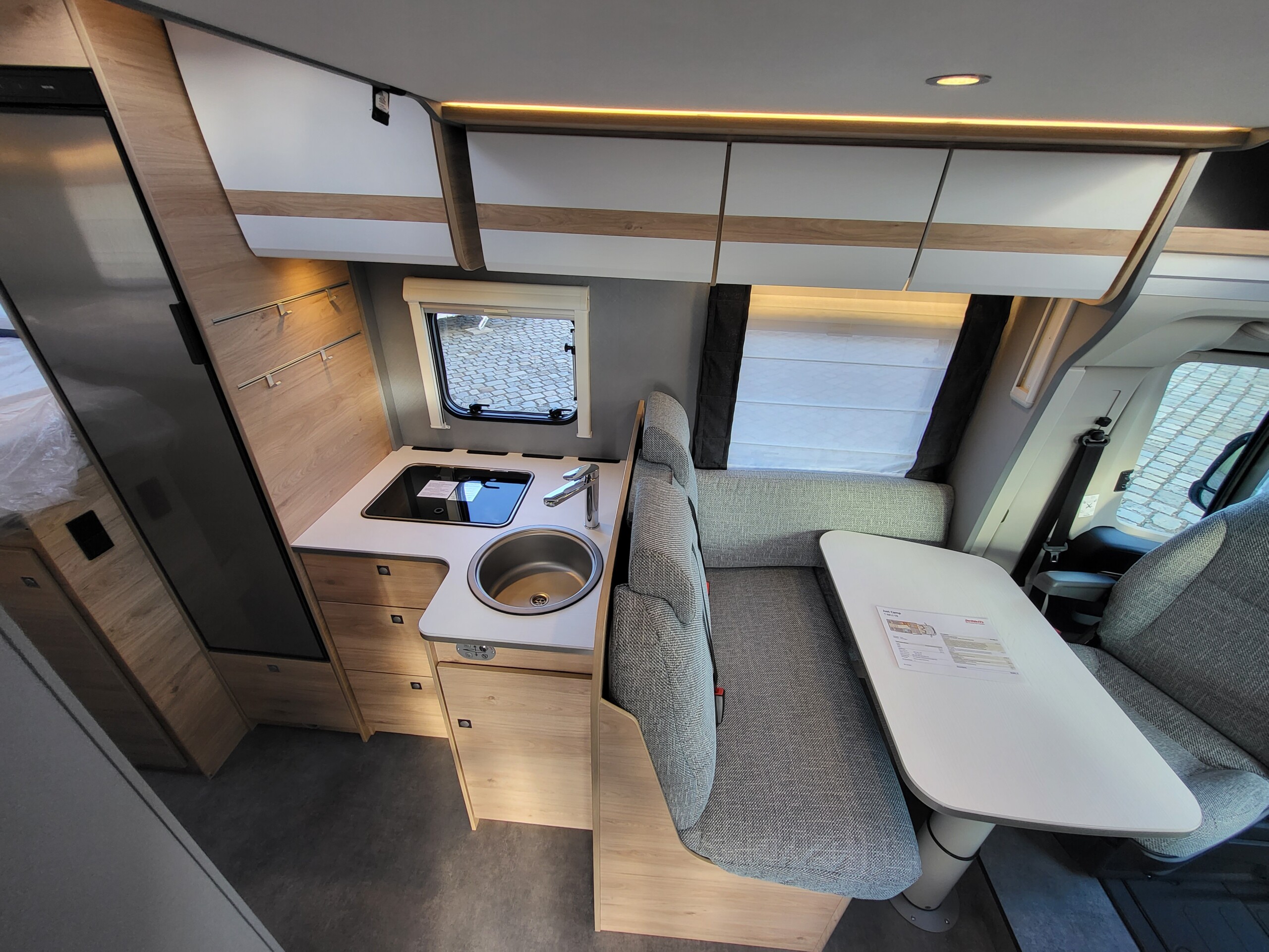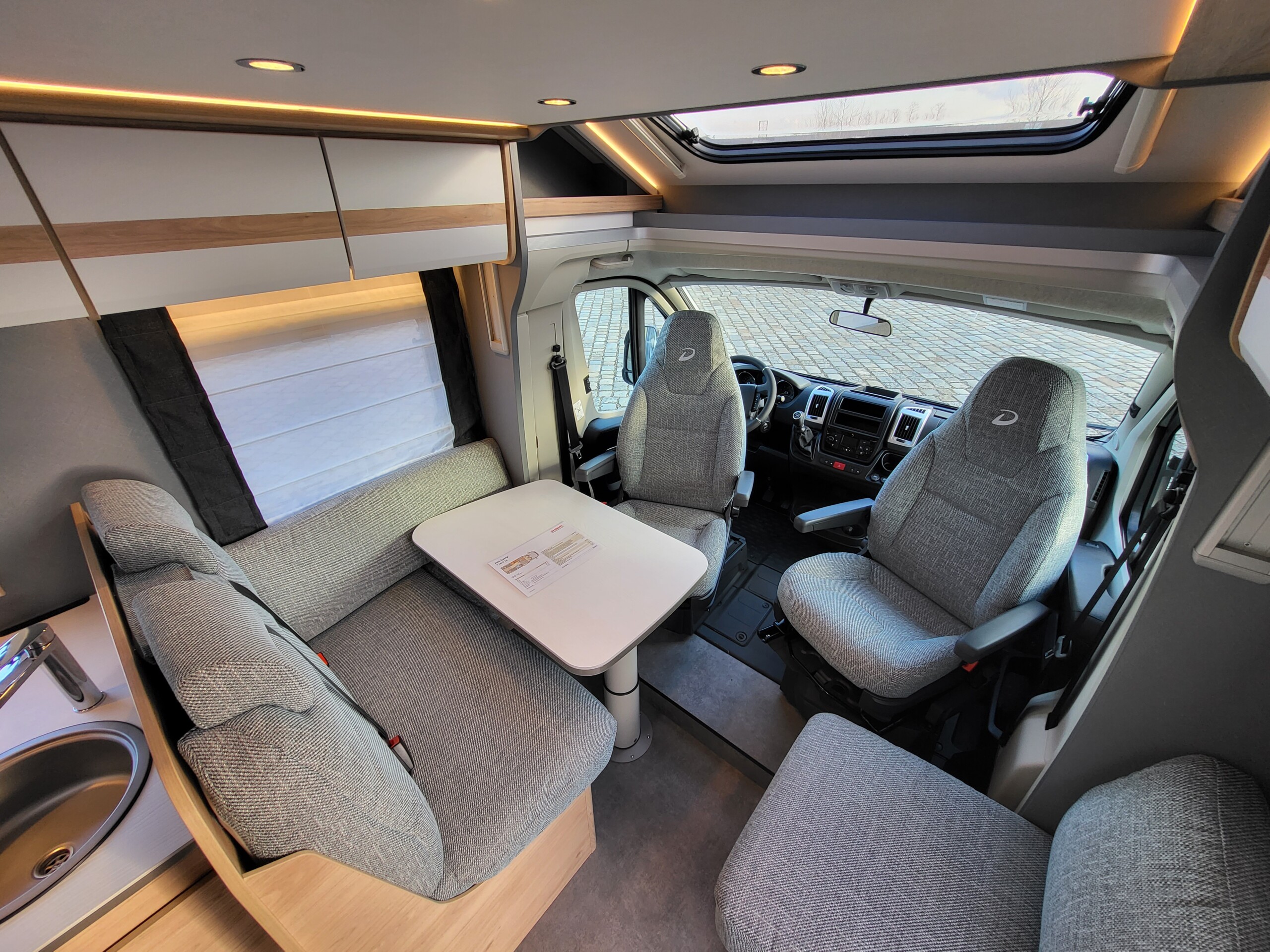 Ausstellfenster in der T-Haube, Wohnraumtür mit Fenster inkl. Verdunklung und Zentralverriegelung (inkl. Fahrerhaustüre), Verdunklungsjalousien im Fahrerhaus, Panorama-Dachhaube 70 x 50 cm im Wohnraum, indirekte Ambientebeleuchtung über den Dachstauschränken, indirekte Wandflächen-Ambientebeleuchtung, Bettumbau Einzelbetten zu Doppelbett, L-Sitzgruppe mit freistehendem, absenkbarem Tischfuß und 2 integrierte 3-Punkt-Gurte, Stauraum-Türe links - Chassis-Paket