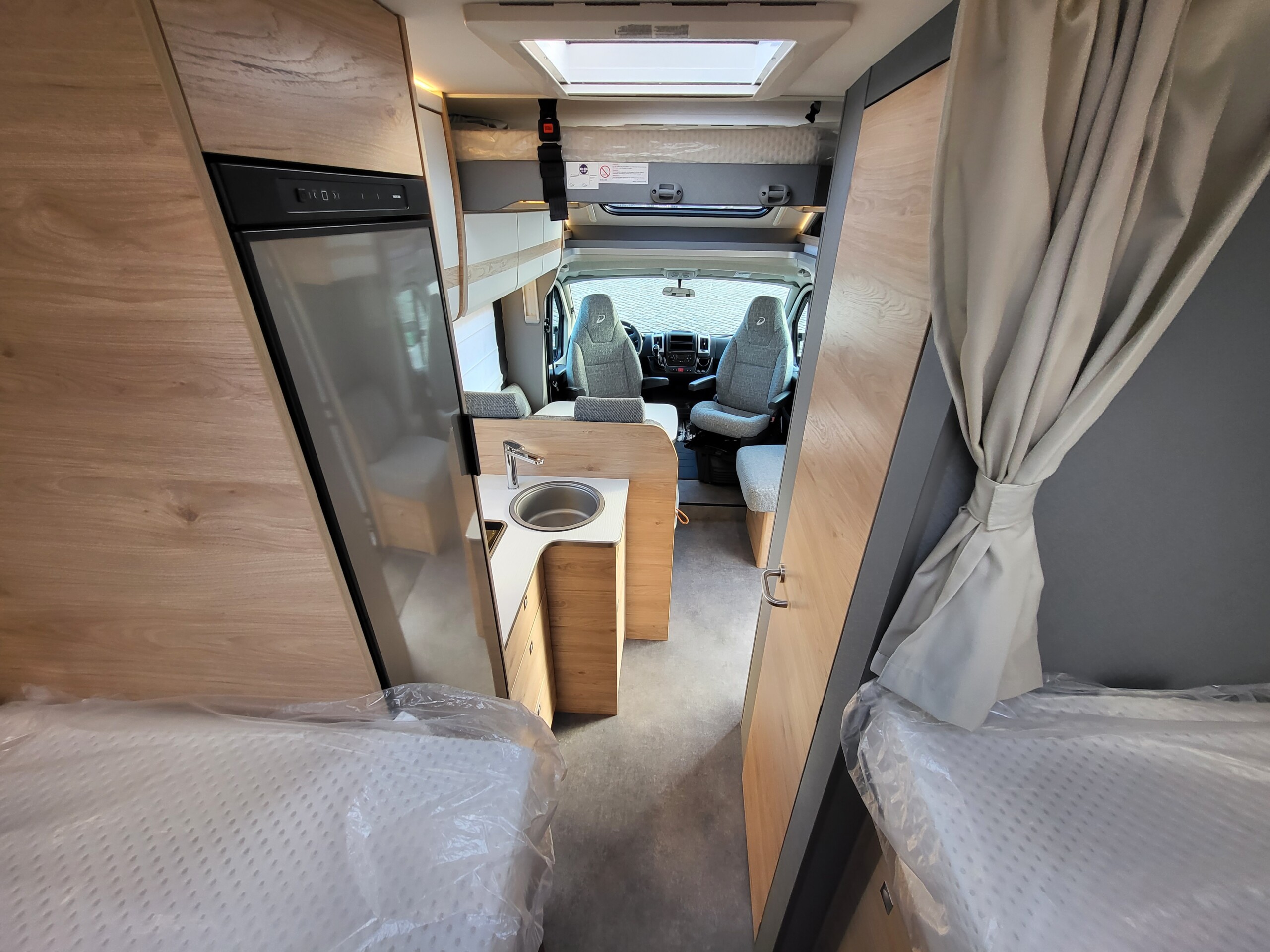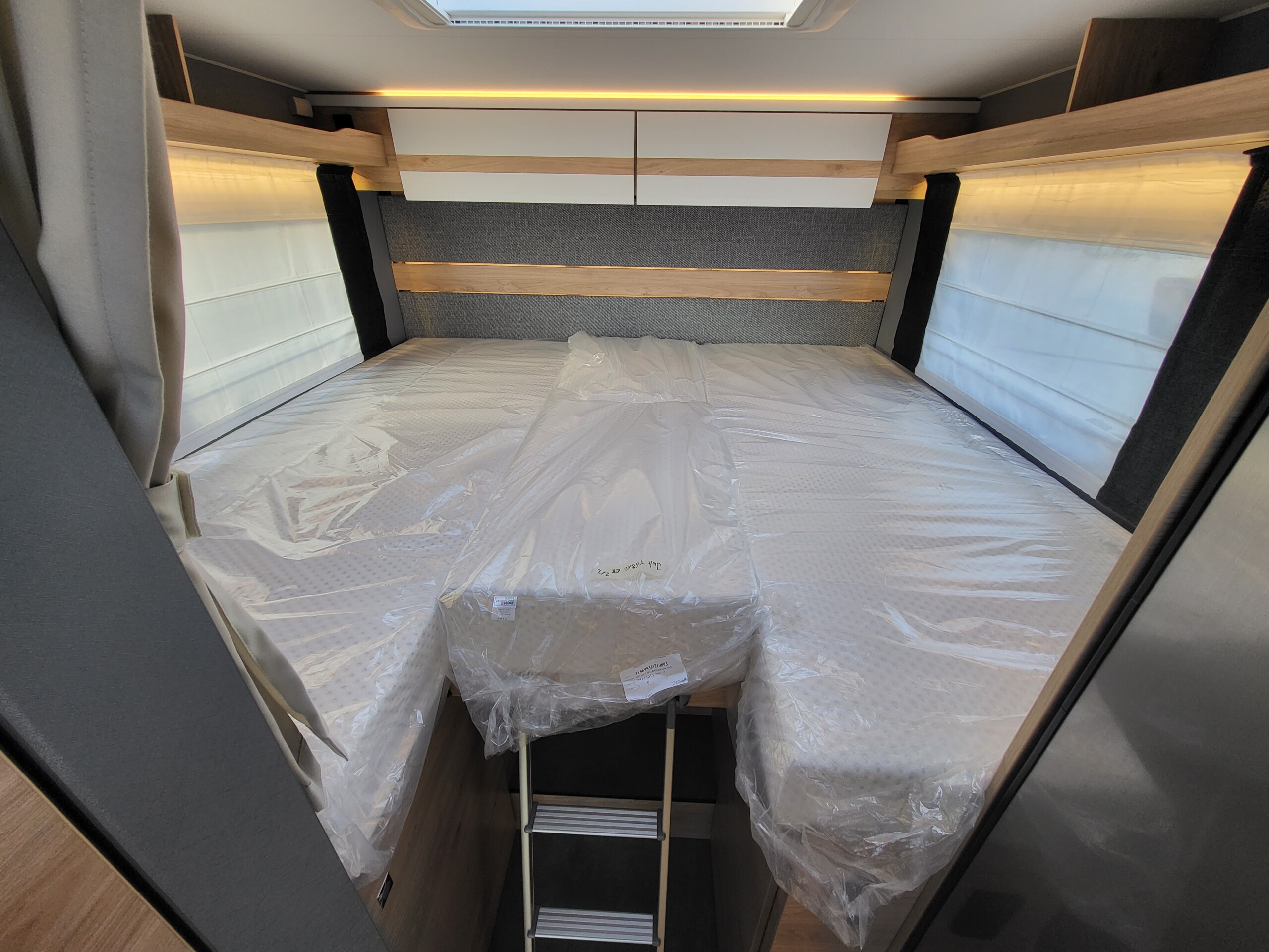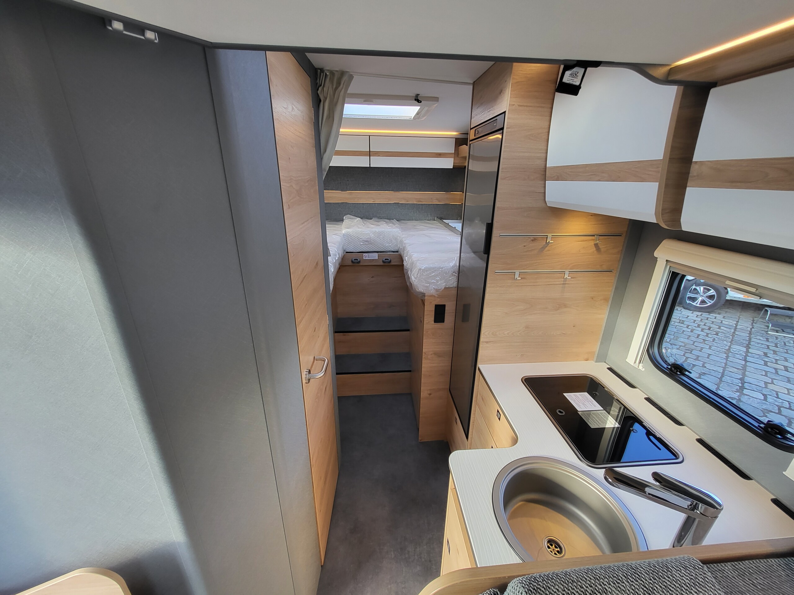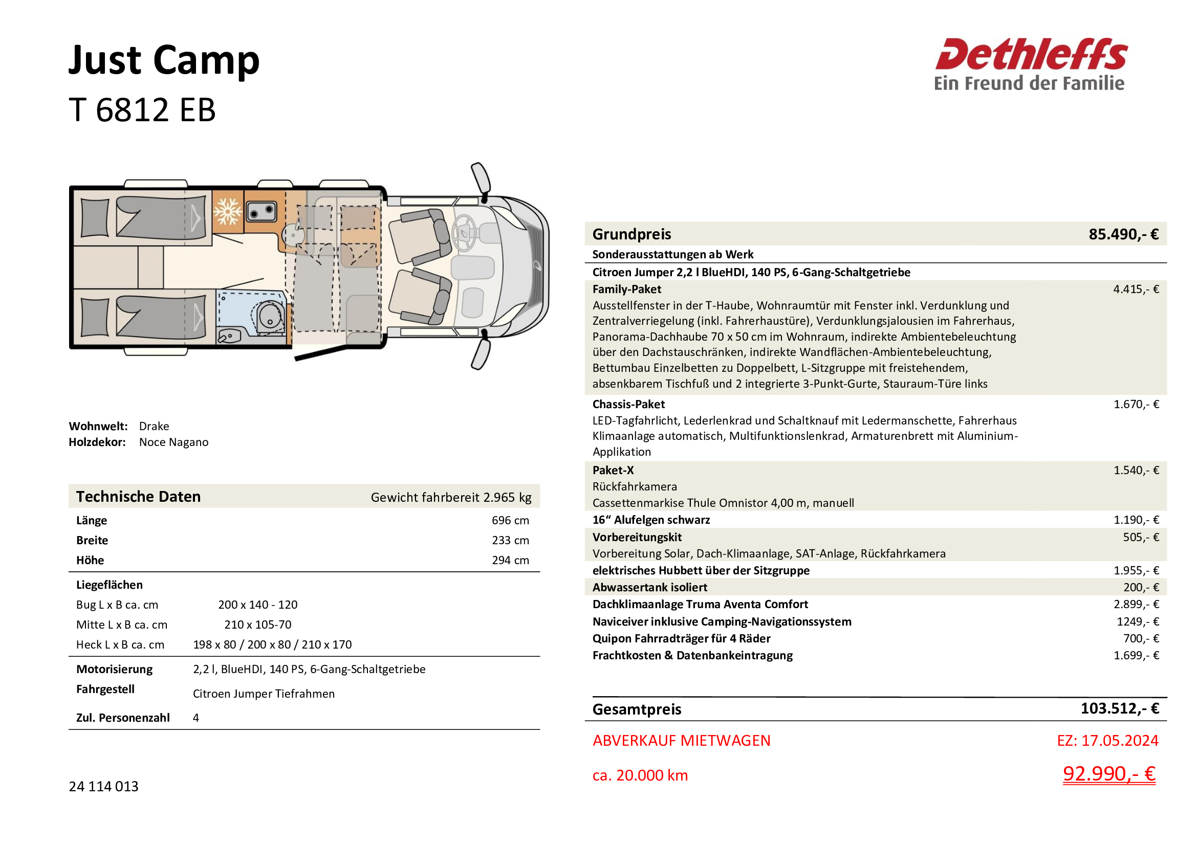 Ausstellfenster in der T-Haube, Wohnraumtür mit Fenster inkl. Verdunklung und Zentralverriegelung (inkl. Fahrerhaustüre), Verdunklungsjalousien im Fahrerhaus, Panorama-Dachhaube 70 x 50 cm im Wohnraum, indirekte Ambientebeleuchtung über den Dachstauschränken, indirekte Wandflächen-Ambientebeleuchtung, Bettumbau Einzelbetten zu Doppelbett, L-Sitzgruppe mit freistehendem, absenkbarem Tischfuß und 2 integrierte 3-Punkt-Gurte, Stauraum-Türe links - Chassis-Paket
