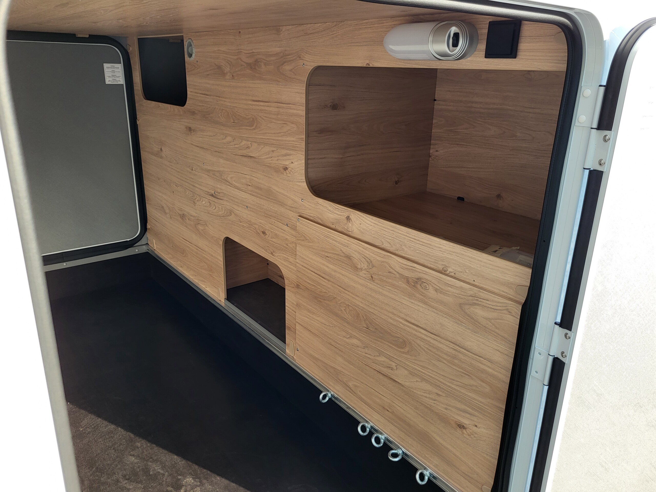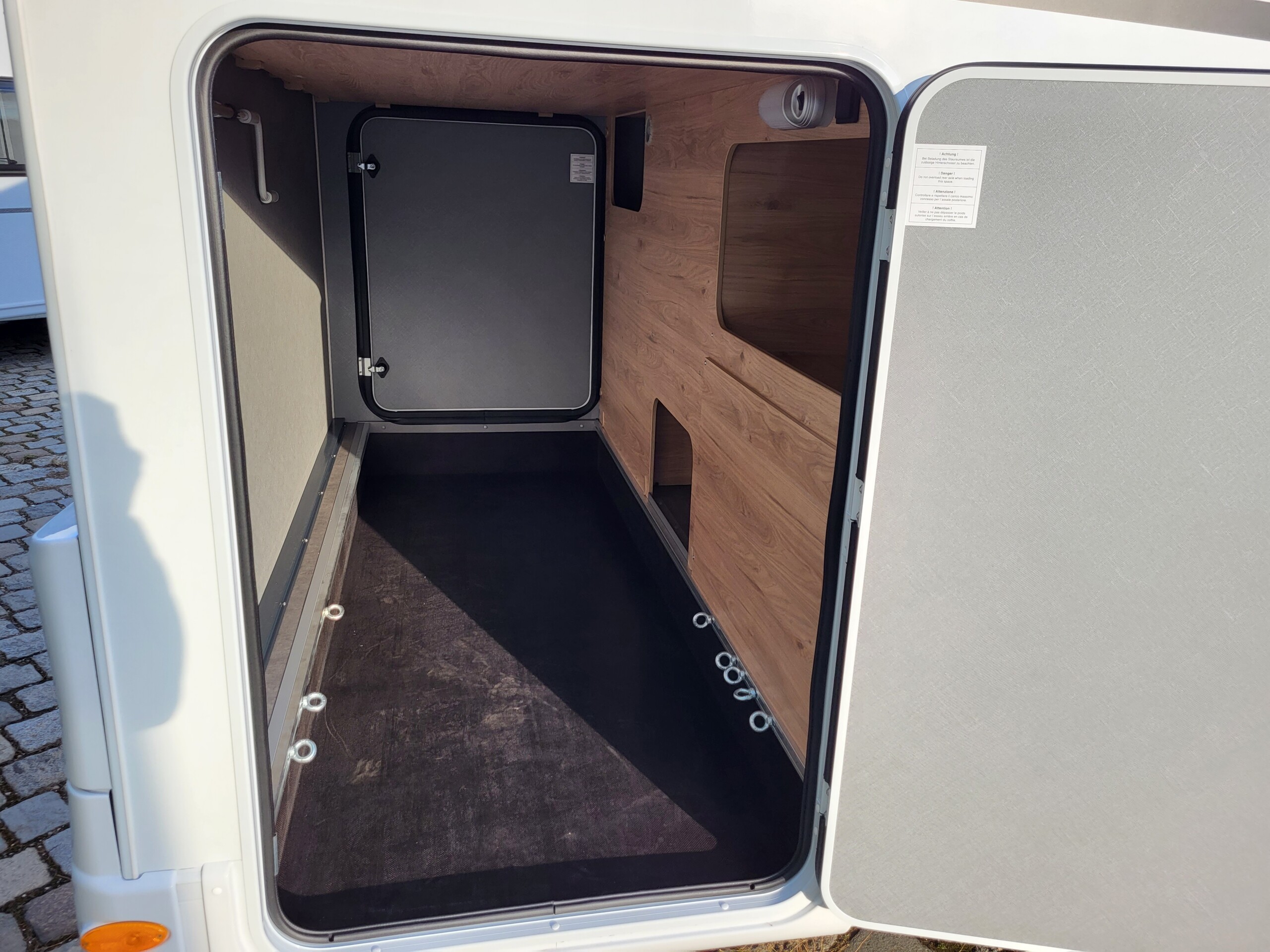 - Große Heckgarage: rechte Garagentüre mit Dreh-/Spannverschluss, Heckabsenkung (150 kg Flächenlast), Anti-Rutsch-Oberfläche, beheizt, Zurrleisten, beleuchtet, 1x 230 V Steckdose
